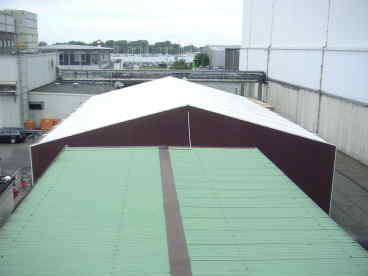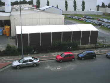 Jedenfalls haben wir bei uns auf dem Gelände derzeit ein kleines Platzproblem. Wir wissen mit unseren leeren Paletten nicht mehr wohin. Deshalb haben wir vor 2 Wochen genau bei uns unterm Fenster ein großes Zelt aufgebaut. Erst wussten wir gar nicht, wofür das sein sollte und haben zunächst auf Bierzelt getippt. Aber das war wohl nix. Dort in dem brauen Zelt soll erst mal ein Teil unserer Paletten gelagert werden.