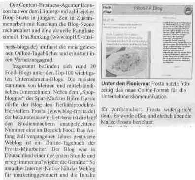 Die Fachzeitung „Lebensmittel Zeitung“ berichtete in der Ausgabe vom 14.07.06 über Weblogs. Ein Ausschnitt hieraus: