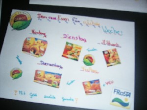 Zuerst haben wir verschiedene Angaben von Lebensmitteln für neue Mitarbeiter im Frosta Bistro kopiert und geordnet. Wir haben Plakate mit verschiedenen Produkten von Frosta hergestellt. Eines von den Plakaten sieht man hier unten auf dem Bild es ist von Lina (schön ne?? =)).
