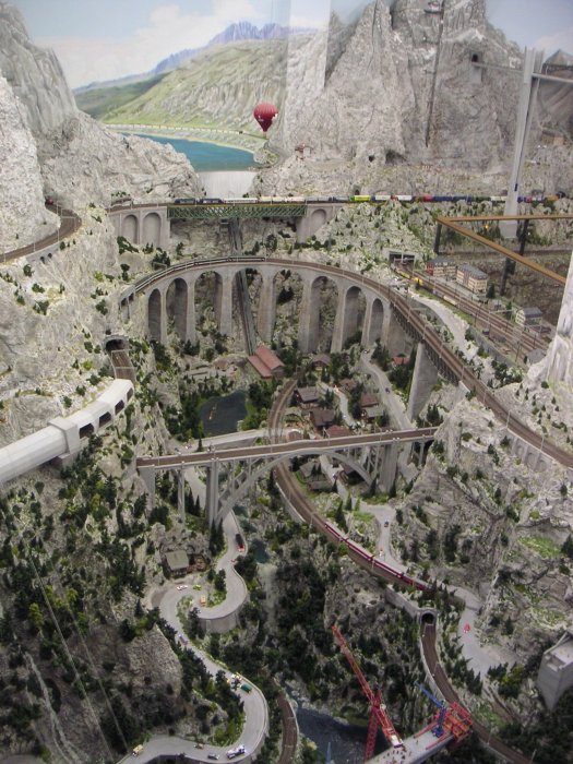 das Miniatur WunderlandBei einer Visite in Hamburg habe ich auch dem Miniatur Wunderland (MiWuLa) einen Besuch abgestattet. Nicht nur für Modelleisenbahnfans ein Vergnügen, denn neben den derzeit ca. 12 km Gleise sind auch unzählige Kleinode, witzige kleine Szenerien und detailgetreue Landschaften und Gebäude in die Anlage eingebettet.Im letzten Jahr wurde der Schweiz-Teil eröffnet, der wegen der hohen Berge über zwei Etagen des Gebäudes geht. Dort ist auch ein Open-Air-Konzert von DJ Bobo aufgebaut mit einem Nachbau der originalen Bühne seiner letzten Tournee. Verschiedene Zuschauer halten Plakate hoch mit den Aufschriften: „Bobo – Ich will ein Kind von Dir“, „Ich will noch ein Kind von Dir“ und „Mach mir bloß kein Kind“. Die übliche Reihe von Dixi-Klos darf natürlich auch nicht fehlen.
