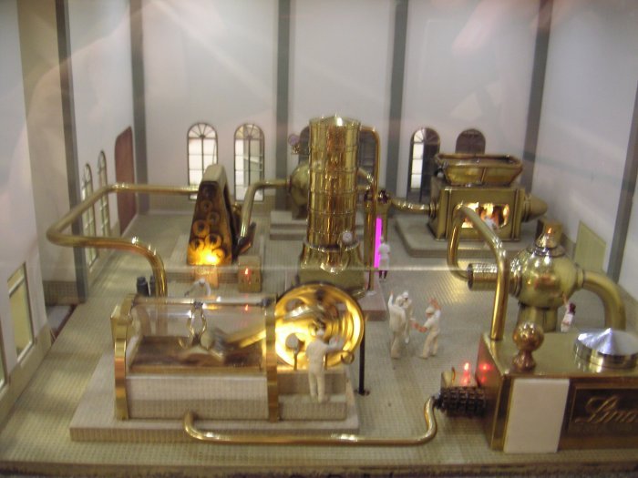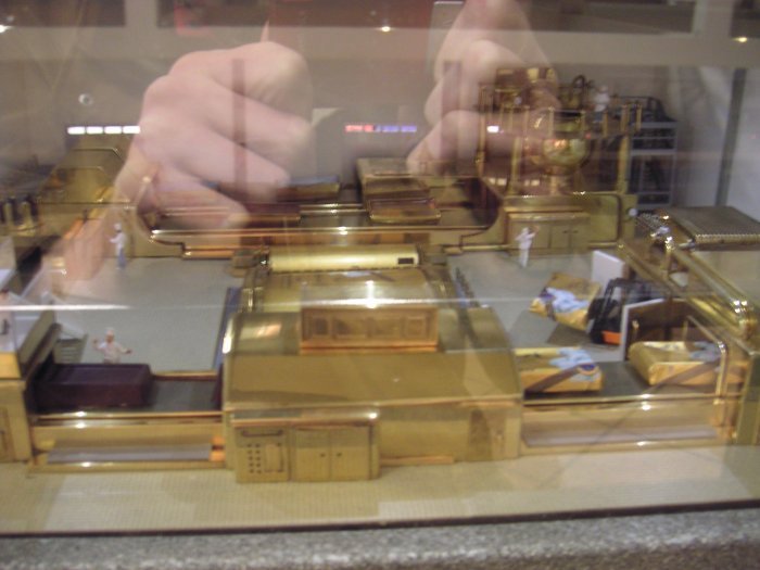 Dann sieht man, wie alles gerührt und conchiert wird und wie ein kleines Stück Schokolade in einer Maschine verschwindet und am anderen Ende verpackt wieder rauskommt.