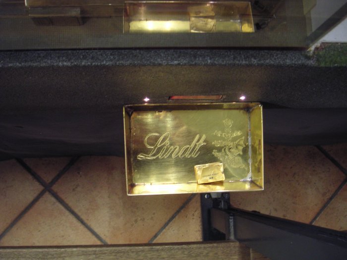 Und der Clou: Am Ende der Prozedur kommt eines dieser verpackten 5g-Stücke Lindt-Schokolade aus der Anlage und fällt in ein kleine Auffangschale. Zum Mitnehmen für die Besucher.