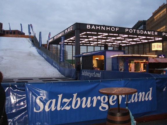 Eine Rodelbahn am Potsdamer Platz – das war der Hammer, Regenwetter und tatsächlich Menschen die für 1,50€ da auf dicken Gummireifen heruntergerutscht sind