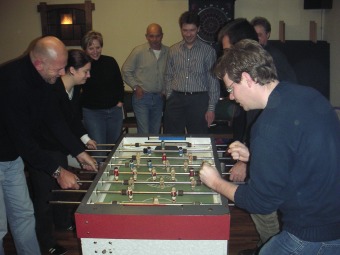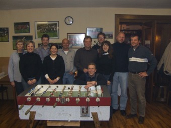 Zwischendurch wurde natürlich auch der Bundesliga Tribut gezollt, ganz unserem Fußball-Motto entsprechend, und wir haben uns gemeinsam die Bundesliga zu Gemüte geführt. Nach Essen und TV-Fußball mussten wir uns dann noch die Pfunde wieder abtrainieren: Ein Tischfussballturnier mit fünf 2er-Team, dass allen viel Spaß gemacht hat, bildete den eigentlichen Höhepunkt des Abends. Zumindest was den Spaß-Faktor angeht.