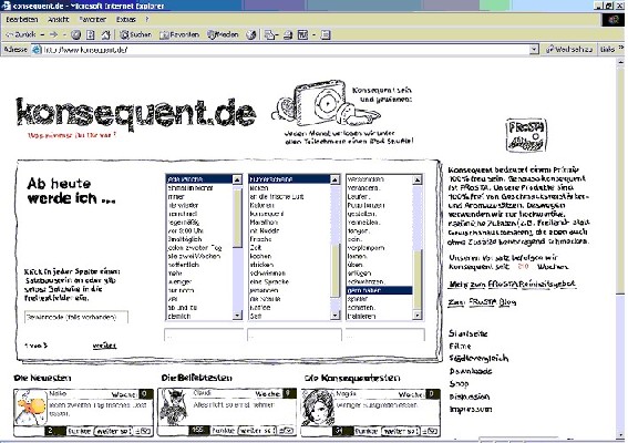 10.02.2007  at 08:24 Hallo Herr Ahlers, mir gefällt das auch ganz gut und ich wünsche Euch viel Erfolg. Ich denke die erste Konsequent-Kampagne war etwas zäh, weil das mit den Videos einstellen wohl nicht jedermanns Sache ist. Da ist das mit einem Bild schon einfacher. Wir sind ja vor einigen Tagen mit unserer Sammel-Wahlkampagne an den Start gegangen. Da sind wir auch sehr gespannt... Aber um auf die Konsequent Kampagne zurückzukommen. Ich mach mit :-)