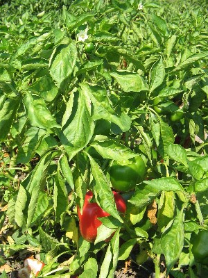 Bild 3: Paprikapflanze mit Blüte und Früchten