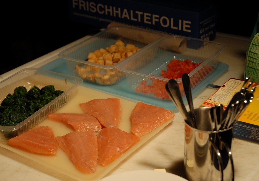 … Original FRoSTA Zutaten (naja, der Lachs und der Blattspinat sind für die Aufnahme diesen Mustern nachgebildet worden, da sie deutlich größer als in Wirklichkeit sein mußten, um am Bildschirm wie das Original zu wirken):