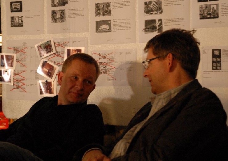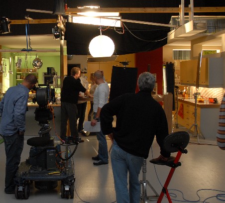 … das Set mit den Hauptakteuren (Peter & Ruth (beide ganz hinten, Regisseur (schwarzes T-shirt), Kameramann (blaues Hemd), Aufnahmeleiter (weißes T-shirt) – das ist übrigends der der immer sagt:“Ton ab!“ dann antwortet der Tontechniker:“Ton läuft!“, dann „Kamera ab!“ und der Kameramann antwortet:“Kamera läuft!“ – und das immer und immer wieder):