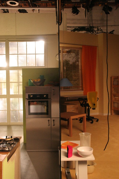 Sehr faszinierend fand ich, daß der „Splitscreen“, also der für die Frosta Werbung typische geteilte Bildschirm nicht erst später beim Schnitt im Studio entsteht, sondern daß er echt ist. Die Kulisse besteht aus den beiden Räumern Küche und Kinderzimmer und in der Mitte ist eine Trennwand gezogen. Wenn man sich genau davor stellt sieht es so aus: