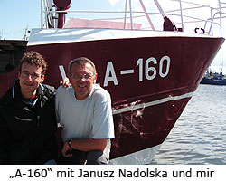 Janusz Nadolska habe ich hier kennen gelernt. Mit seinem Boot „A-160“ fischt er hier nach wie vor – seit 3 Generationen! Die Fischquoten sind in der Ostsee stark limitiert. Jedes einlaufende Boot wird streng kontrolliert. Insgesamt darf die A-160 nur 32 Tonnen Dorsch pro Jahr fangen. Für Hering und Scholle ist die Quote etwas höher, allerdings bekommen die Fischer für diese Fischsorten auch wesentlich weniger Geld. Für 1 kg Scholle gibt es nur 0,60 €, für Hering sogar nur 0,30 €/kg! Dorsch wird dagegen für etwa 2,50 €/kg gehandelt, Ostseelachs sogar für 5 €. Dieser Wildlachs schmeckt übrigens viel besser als der Lachs aus den norwegischen Lachsfarmen! Er ist fettärmer und weniger intensiv rot, weil die Lachse nicht, wie in den Farmen, mit Farbstoffen (Carotin) gefüttert werden!