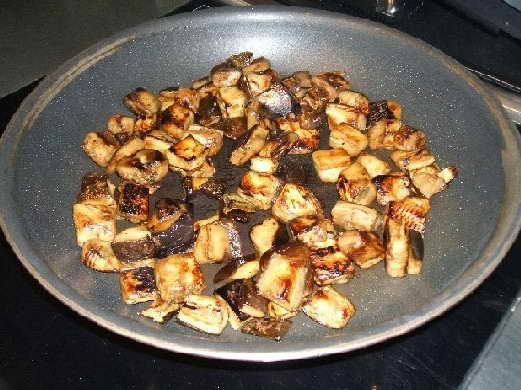 Um den Grillgeschmack zu intensivieren, braten wir die Auberginen und Paprika kurz in der Pfanne an.