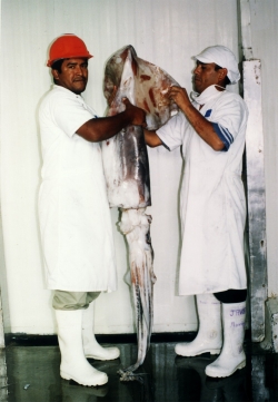 Und so sehen die Riesenkalamaris aus: Es gibt unendliche große Mengen davon, so dass die Bestände nicht gefährdet sind. Hieraus werden dann die Filets geschnitten.